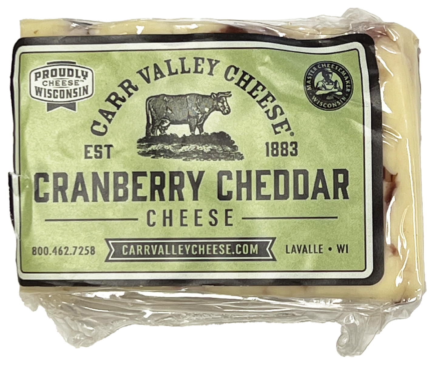 This cranberry Cheddar is a gourmet beautiful artisan white cheddar that is accentuated with sweet Wisconsin cranberries. This lovely cheese would be an elegant addition to your favorite sandwich or cheese tray.